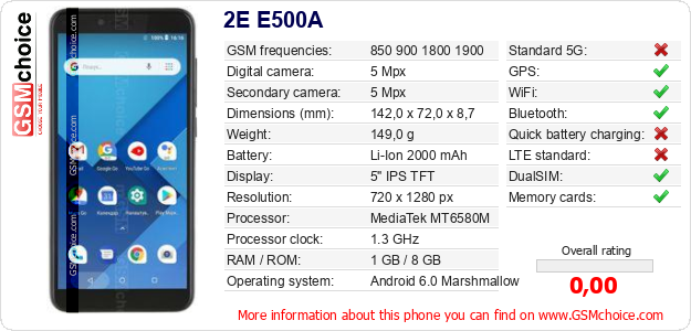 Do you have your website? Do you want to insert information about basic phone data of 2E E500A somewhere? It is very easy. You can download the picture, or copy and paste the code below on the page:Pasting this code will display the following image: