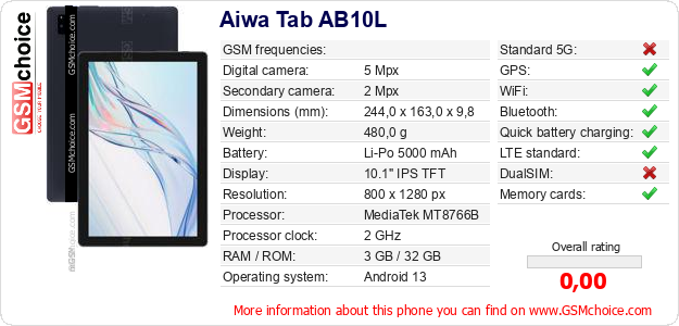 Do you have your website? Do you want to insert information about basic phone data of Aiwa Tab AB10L somewhere? It is very easy. You can download the picture, or copy and paste the code below on the page:Pasting this code will display the following image: