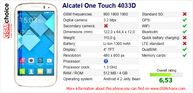 Do you have your website? Do you want to insert information about basic phone data of Alcatel One Touch 4033D somewhere? It is very easy. You can download the picture, or copy and paste the code below on the page:Pasting this code will display the following image: