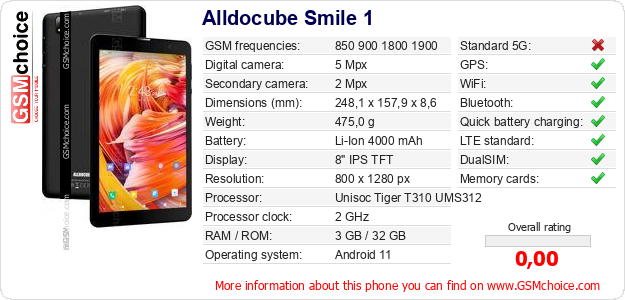 Do you have your website? Do you want to insert information about basic phone data of Alldocube Smile 1 somewhere? It is very easy. You can download the picture, or copy and paste the code below on the page:Pasting this code will display the following image: