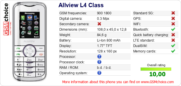 Do you have your website? Do you want to insert information about basic phone data of Allview L4 Class somewhere? It is very easy. You can download the picture, or copy and paste the code below on the page:Pasting this code will display the following image: