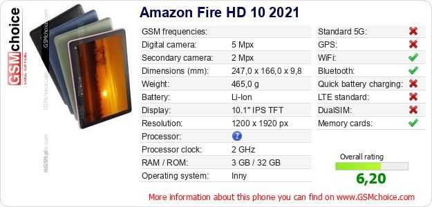 Do you have your website? Do you want to insert information about basic phone data of Amazon Fire HD 10 2021 somewhere? It is very easy. You can download the picture, or copy and paste the code below on the page:Pasting this code will display the following image: