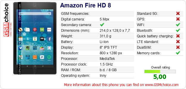 Do you have your website? Do you want to insert information about basic phone data of Amazon Fire HD 8 somewhere? It is very easy. You can download the picture, or copy and paste the code below on the page:Pasting this code will display the following image: