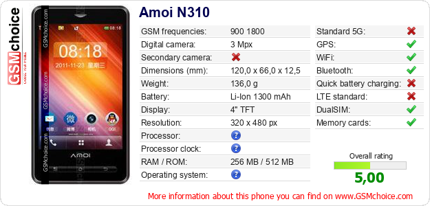Do you have your website? Do you want to insert information about basic phone data of Amoi N310 somewhere? It is very easy. You can download the picture, or copy and paste the code below on the page:Pasting this code will display the following image: