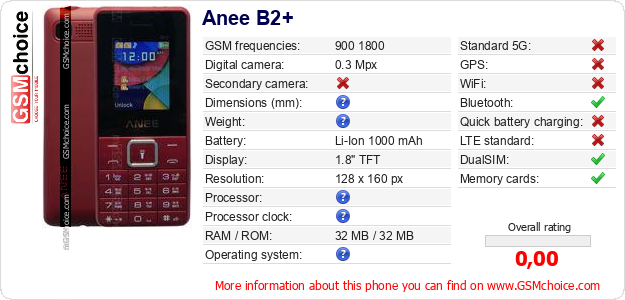 Do you have your website? Do you want to insert information about basic phone data of Anee B2+ somewhere? It is very easy. You can download the picture, or copy and paste the code below on the page:Pasting this code will display the following image: