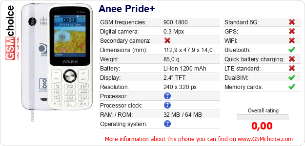 Do you have your website? Do you want to insert information about basic phone data of Anee Pride+ somewhere? It is very easy. You can download the picture, or copy and paste the code below on the page:Pasting this code will display the following image: