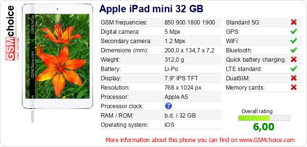 Do you have your website? Do you want to insert information about basic phone data of Apple iPad mini 32 GB somewhere? It is very easy. You can download the picture, or copy and paste the code below on the page:Pasting this code will display the following image: