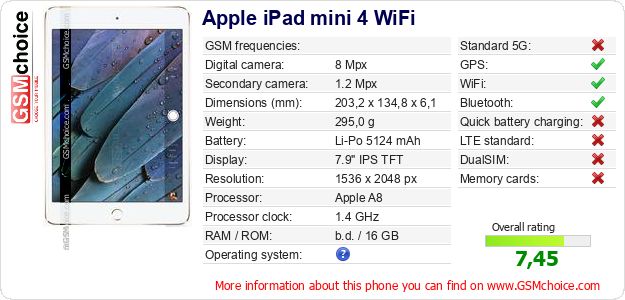Do you have your website? Do you want to insert information about basic phone data of Apple iPad mini 4 WiFi somewhere? It is very easy. You can download the picture, or copy and paste the code below on the page:Pasting this code will display the following image:
