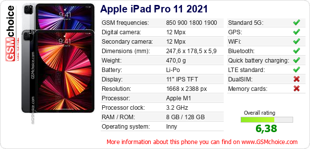 Do you have your website? Do you want to insert information about basic phone data of Apple iPad Pro 11 2021 somewhere? It is very easy. You can download the picture, or copy and paste the code below on the page:Pasting this code will display the following image: