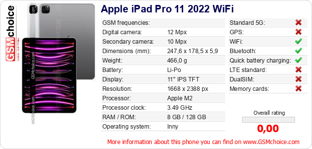 Do you have your website? Do you want to insert information about basic phone data of Apple iPad Pro 11 2022 WiFi somewhere? It is very easy. You can download the picture, or copy and paste the code below on the page:Pasting this code will display the following image: