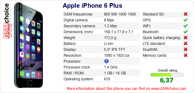 Do you have your website? Do you want to insert information about basic phone data of Apple iPhone 6 Plus somewhere? It is very easy. You can download the picture, or copy and paste the code below on the page:Pasting this code will display the following image: