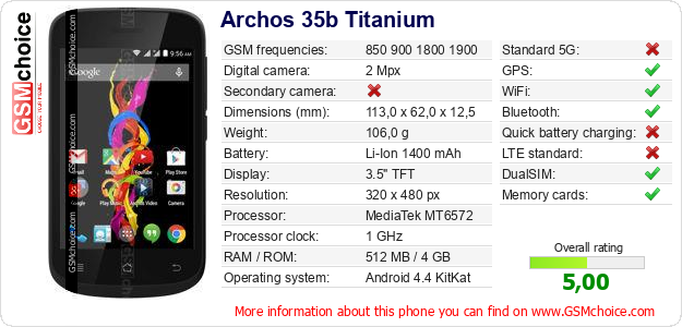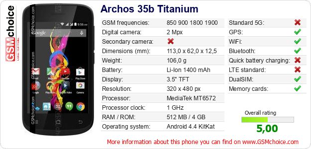 Do you have your website? Do you want to insert information about basic phone data of Archos 35b Titanium somewhere? It is very easy. You can download the picture, or copy and paste the code below on the page:Pasting this code will display the following image:
