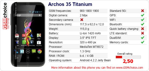 Do you have your website? Do you want to insert information about basic phone data of Archos 35 Titanium somewhere? It is very easy. You can download the picture, or copy and paste the code below on the page:Pasting this code will display the following image: