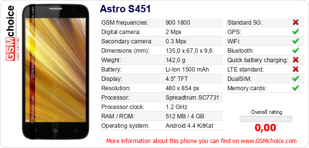 Do you have your website? Do you want to insert information about basic phone data of Astro S451 somewhere? It is very easy. You can download the picture, or copy and paste the code below on the page:Pasting this code will display the following image: