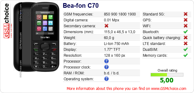 Do you have your website? Do you want to insert information about basic phone data of Bea-fon C70 somewhere? It is very easy. You can download the picture, or copy and paste the code below on the page:Pasting this code will display the following image: