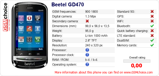 Do you have your website? Do you want to insert information about basic phone data of Beetel GD470 somewhere? It is very easy. You can download the picture, or copy and paste the code below on the page:Pasting this code will display the following image: