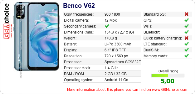 Do you have your website? Do you want to insert information about basic phone data of Benco V62 somewhere? It is very easy. You can download the picture, or copy and paste the code below on the page:Pasting this code will display the following image:
