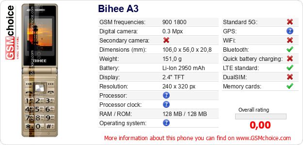 Do you have your website? Do you want to insert information about basic phone data of Bihee A3 somewhere? It is very easy. You can download the picture, or copy and paste the code below on the page:Pasting this code will display the following image: