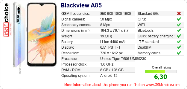 Do you have your website? Do you want to insert information about basic phone data of Blackview A85 somewhere? It is very easy. You can download the picture, or copy and paste the code below on the page:Pasting this code will display the following image:
