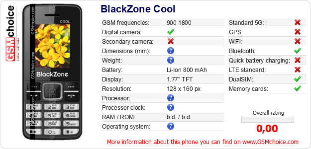 Do you have your website? Do you want to insert information about basic phone data of BlackZone Cool somewhere? It is very easy. You can download the picture, or copy and paste the code below on the page:Pasting this code will display the following image:
