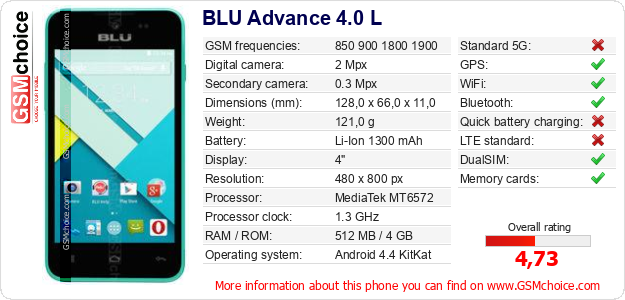 Do you have your website? Do you want to insert information about basic phone data of BLU Advance 4.0 L somewhere? It is very easy. You can download the picture, or copy and paste the code below on the page:Pasting this code will display the following image: