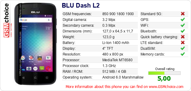 Do you have your website? Do you want to insert information about basic phone data of BLU Dash L2 somewhere? It is very easy. You can download the picture, or copy and paste the code below on the page:Pasting this code will display the following image: