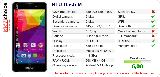 Do you have your website? Do you want to insert information about basic phone data of BLU Dash M somewhere? It is very easy. You can download the picture, or copy and paste the code below on the page:Pasting this code will display the following image: