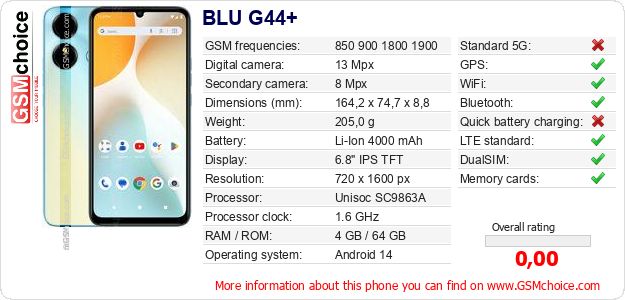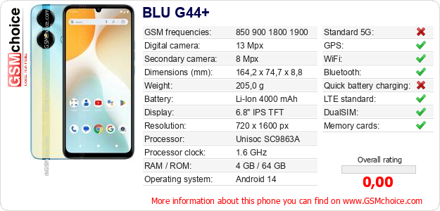 Do you have your website? Do you want to insert information about basic phone data of BLU G44+ somewhere? It is very easy. You can download the picture, or copy and paste the code below on the page:Pasting this code will display the following image: