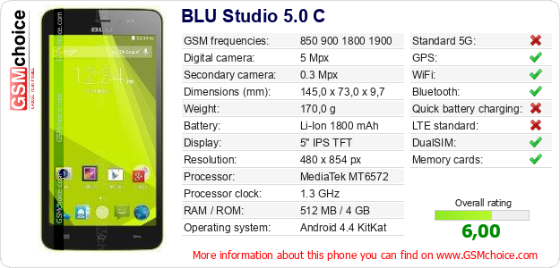 Do you have your website? Do you want to insert information about basic phone data of BLU Studio 5.0 C somewhere? It is very easy. You can download the picture, or copy and paste the code below on the page:Pasting this code will display the following image: