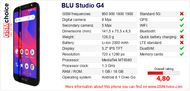 Do you have your website? Do you want to insert information about basic phone data of BLU Studio G4 somewhere? It is very easy. You can download the picture, or copy and paste the code below on the page:Pasting this code will display the following image: