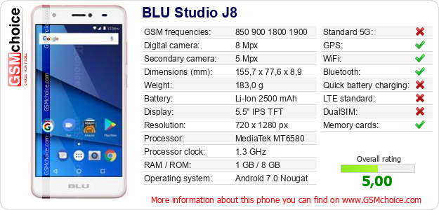 Do you have your website? Do you want to insert information about basic phone data of BLU Studio J8 somewhere? It is very easy. You can download the picture, or copy and paste the code below on the page:Pasting this code will display the following image: