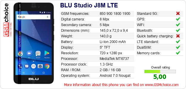 Do you have your website? Do you want to insert information about basic phone data of BLU Studio J8M LTE somewhere? It is very easy. You can download the picture, or copy and paste the code below on the page:Pasting this code will display the following image: