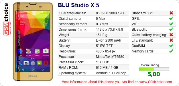 Do you have your website? Do you want to insert information about basic phone data of BLU Studio X 5 somewhere? It is very easy. You can download the picture, or copy and paste the code below on the page:Pasting this code will display the following image: