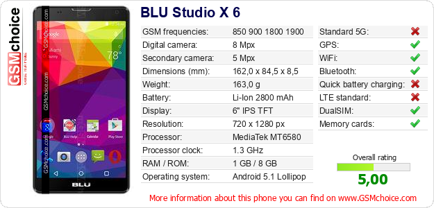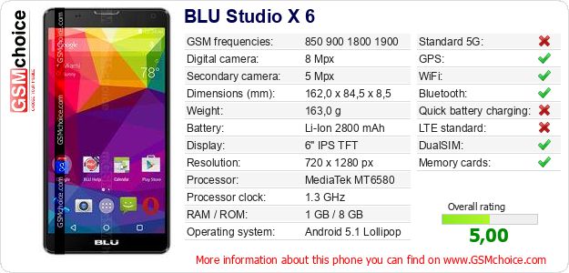 Do you have your website? Do you want to insert information about basic phone data of BLU Studio X 6 somewhere? It is very easy. You can download the picture, or copy and paste the code below on the page:Pasting this code will display the following image: