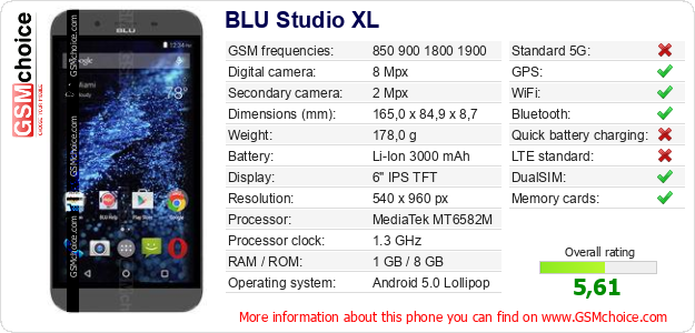 Do you have your website? Do you want to insert information about basic phone data of BLU Studio XL somewhere? It is very easy. You can download the picture, or copy and paste the code below on the page:Pasting this code will display the following image: