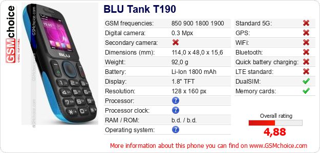 Do you have your website? Do you want to insert information about basic phone data of BLU Tank T190 somewhere? It is very easy. You can download the picture, or copy and paste the code below on the page:Pasting this code will display the following image: