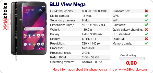 Do you have your website? Do you want to insert information about basic phone data of BLU View Mega somewhere? It is very easy. You can download the picture, or copy and paste the code below on the page:Pasting this code will display the following image: