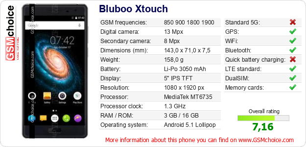 Do you have your website? Do you want to insert information about basic phone data of Bluboo Xtouch somewhere? It is very easy. You can download the picture, or copy and paste the code below on the page:Pasting this code will display the following image: