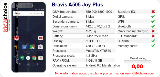 Do you have your website? Do you want to insert information about basic phone data of Bravis A505 Joy Plus somewhere? It is very easy. You can download the picture, or copy and paste the code below on the page:Pasting this code will display the following image: