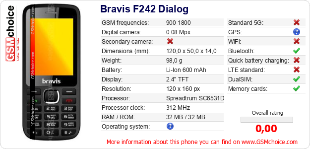 Do you have your website? Do you want to insert information about basic phone data of Bravis F242 Dialog somewhere? It is very easy. You can download the picture, or copy and paste the code below on the page:Pasting this code will display the following image: