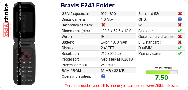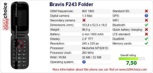 Do you have your website? Do you want to insert information about basic phone data of Bravis F243 Folder somewhere? It is very easy. You can download the picture, or copy and paste the code below on the page:Pasting this code will display the following image: