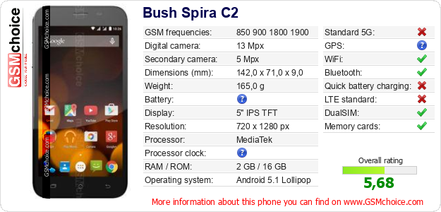 Do you have your website? Do you want to insert information about basic phone data of Bush Spira C2 somewhere? It is very easy. You can download the picture, or copy and paste the code below on the page:Pasting this code will display the following image: