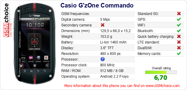 Do you have your website? Do you want to insert information about basic phone data of Casio G'zOne Commando somewhere? It is very easy. You can download the picture, or copy and paste the code below on the page:Pasting this code will display the following image: