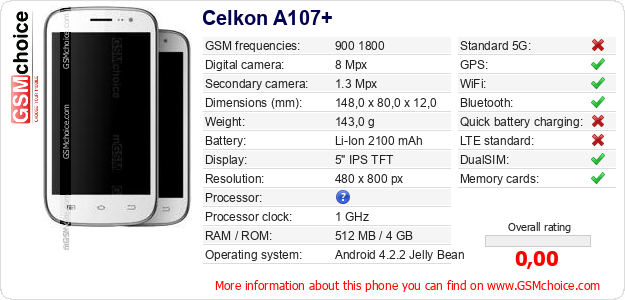 Do you have your website? Do you want to insert information about basic phone data of Celkon A107+ somewhere? It is very easy. You can download the picture, or copy and paste the code below on the page:Pasting this code will display the following image: