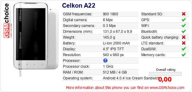 Do you have your website? Do you want to insert information about basic phone data of Celkon A22 somewhere? It is very easy. You can download the picture, or copy and paste the code below on the page:Pasting this code will display the following image: