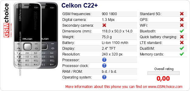 Do you have your website? Do you want to insert information about basic phone data of Celkon C22+ somewhere? It is very easy. You can download the picture, or copy and paste the code below on the page:Pasting this code will display the following image: