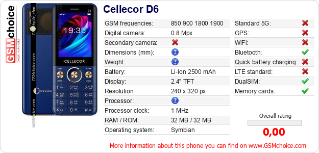 Do you have your website? Do you want to insert information about basic phone data of Cellecor D6 somewhere? It is very easy. You can download the picture, or copy and paste the code below on the page:Pasting this code will display the following image: