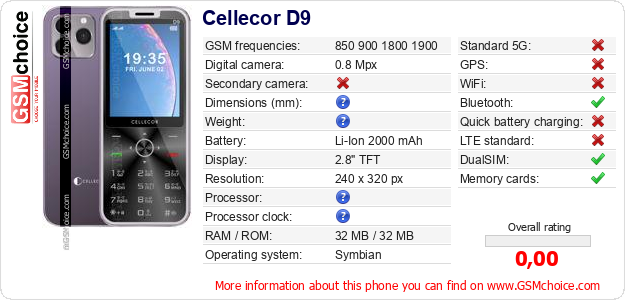Do you have your website? Do you want to insert information about basic phone data of Cellecor D9 somewhere? It is very easy. You can download the picture, or copy and paste the code below on the page:Pasting this code will display the following image: