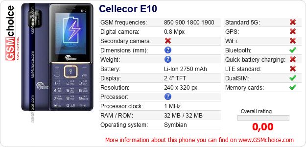 Do you have your website? Do you want to insert information about basic phone data of Cellecor E10 somewhere? It is very easy. You can download the picture, or copy and paste the code below on the page:Pasting this code will display the following image: