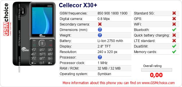 Do you have your website? Do you want to insert information about basic phone data of Cellecor X30+ somewhere? It is very easy. You can download the picture, or copy and paste the code below on the page:Pasting this code will display the following image:
